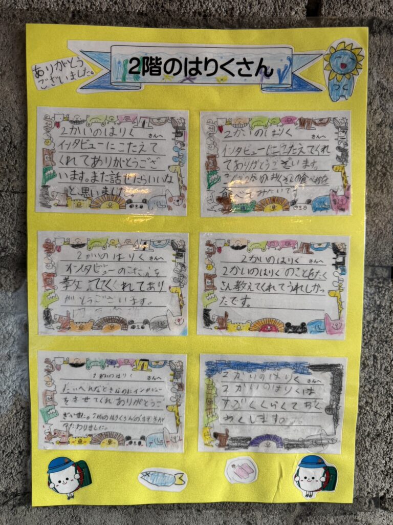 亀戸水神小学校の子供たちの「将来の職業インタビュー」活動を受けさせて頂きました 2026.01.23 亀戸水神小学校の子供たちの「将来の職業インタビュー」活動を、「2階のはりく」店長が受けさせて頂きました。 <子供たちのインタビューの様子> <亀戸水神小学校の子供たちより感想のお手紙>