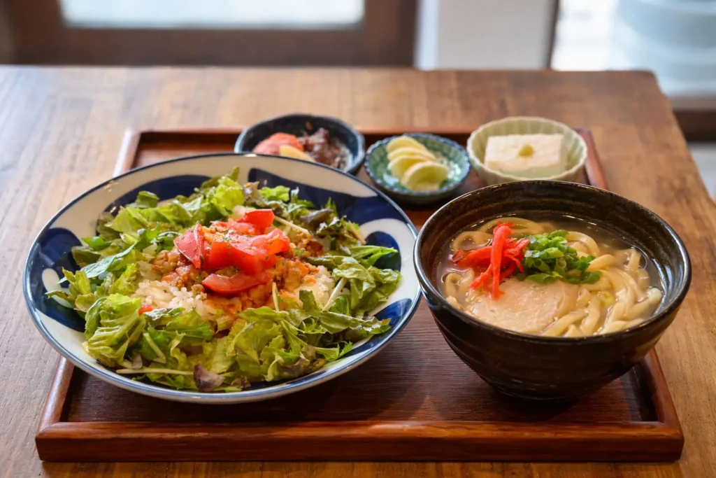 - タコライスと沖縄そば定食(お新香、小鉢2個、ちんすこう):1000円(税込)